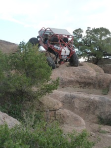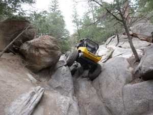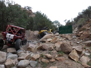Today is so exciting, since we are headed to a new trail for us. The mystery of what is in front of us brings a state of nervous anticipation. The trail is right off the main road and boom, quickly begins in a massive boulder field and an immediate climb in elevation. Now these rocks are big. Yahhoooo! Artie and Larry make some inspections and decide on a course of action and we are off like dirty shirts! Artie is spotting me through with Larry following. There is truly no gap in obstacles - nonstop challenges - and we are having a ball. About midway I get my front end in a slight bind and pow! a front axle breaks. We are always prepared with spare parts, so after about 2 hrs we are back on the trail. We have no more mishaps and make it to the monster exit with plenty of daylight to spare! We marvel at the ending waterfall with high walls lining each side of the trail. Feel like the bad guys in the western movies coming to the end of a box canyon! Artie takes over and both he and Larry get the front end up and give some attempts and playtime on the wall. After getting some help with the winch we pop out on top. Boulder Canyon did not disappoint! We WILL be back one day! This is a PERFECT ending to an awesome extreme wheeling trip!