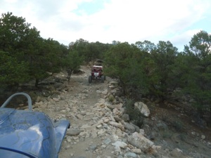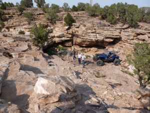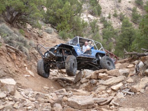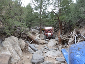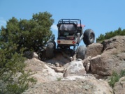 Carnage Canyon! How to describe this hard core trail? Beautiful and challenging. Fun. Adrenaline pumping. Definitely a trail that must be on the list of top extreme. We start early knowing we need to give Carnage our full attention. It begins in a creek bed and the rocks become increasingly larger as it climbs. Technical placement of tires begins to be crucial. Then the true nature of Carnage shows its colors! In front of us is a double wammy ledge and massive V crack. Very little margin of error exits and any mistake will put you on your side. We make it through these two obstacles, some easier than others, and begin picking our way over massive boulders, one after another. We become at ease with the trail, enjoying its beauty and difficulty, when a medusa of an exit rears its head. A series of huge boulders create an undulating wall - straight up. Well this is what we came for, so lets look at our options. The right line includes straddling a notch. Mistake = land on your side in an awkward position to get recovered. Center line creates a point that will certainly work as an anchor on the rear diff. The left line is a two layered step. Jim picks the right line, slips the front tire off the top edge and bangs down hard on his side. He is pulled by the winch from several different angles to get him into a good position to make it over the notch. He accomplishes this and is relatively unscathed. Nancy is next and wants the center choice and easily pops up the front end. No matter how she adjust her line, she can’t get the rear to clear, so we give her a tiny tug of the winch and she is on the top. Larry picks the same line and proceeds accordingly with the help of the winch. On the top he is unhooked, backs up to make the slight right turn to exit and VERY NEARLY backs off the edge! That was a close call! It is now my turn and all I want to do is make it up wherever Artie spots me! We want the left line, but our rear keeps hanging up. Getting hooked to the winch and walking it over to the center line gets good success and the group is up! Our use of the winch in this wicked exit is just good sense. A mistake could end in a devastating roll.